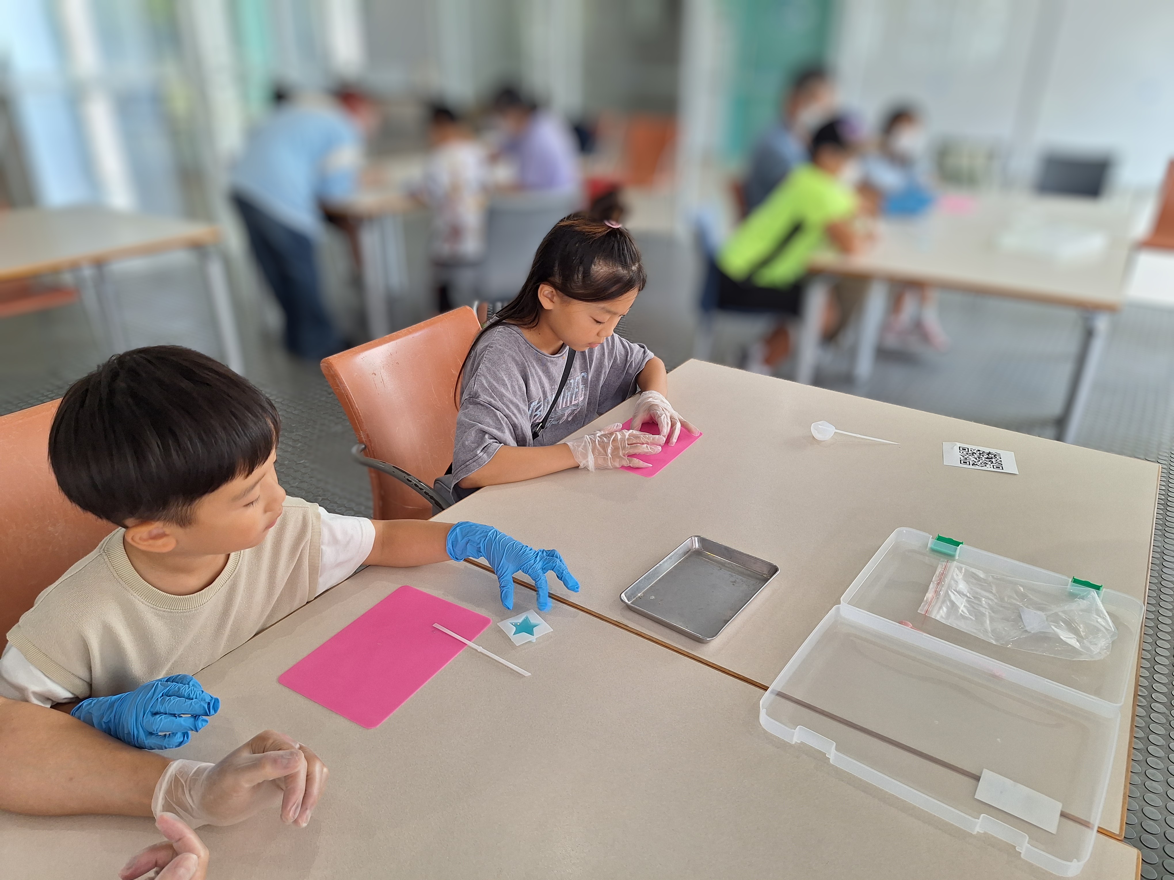 定員を超える多数の申し込みがあり、厳正な抽選のうえ約100名の児童・保護者の参加を得て、前半・後半の二部制で実施しました。レゴブロックを用いたプログラミング、電子工作、紫外線を利用したレジンアクセサリー作りを通して「光とものづくりの不思議」を学ぶほか、ブラックライトによる「手洗いの科学」体験で、洗い残しの汚れを“見える化”し、感染予防の重要性を楽しく学びました。臨床工学技士の重要な業務である人工透析についても実験を通して学びました。参加者からは「科学が身近になった」「医療のお仕事に興味を持った」といった感想が寄せられ、親子で熱心に取り組む姿が印象的でした。