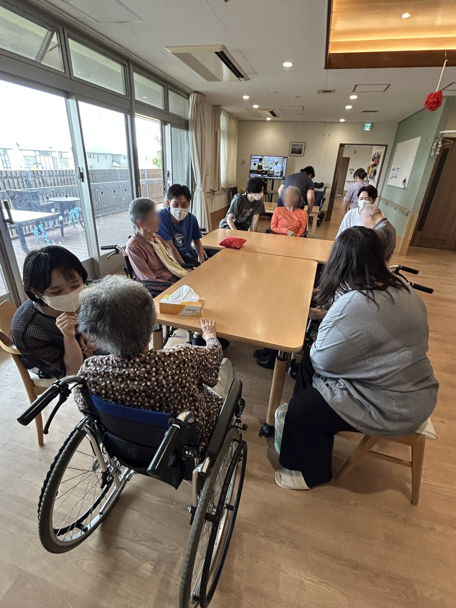 学生も利用者さんも初めは緊張しておりましたが、利用者さんのお話を伺ったり、学生生活についてのお話しをしていくことでどんどんリラックスした雰囲気となり、利用者さんと楽しくコミュニケーションを取ることができました。