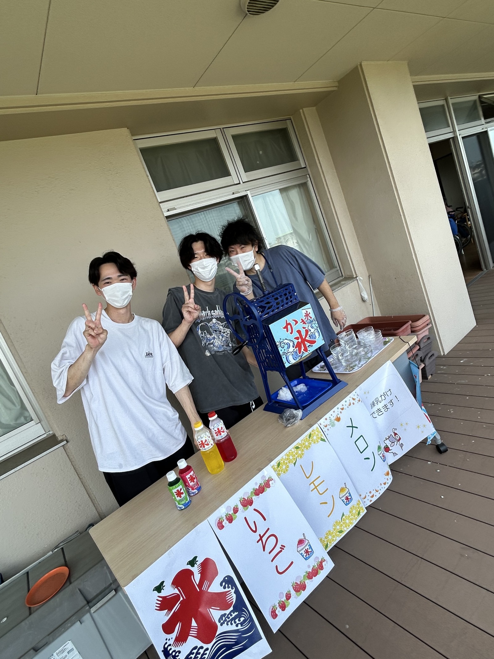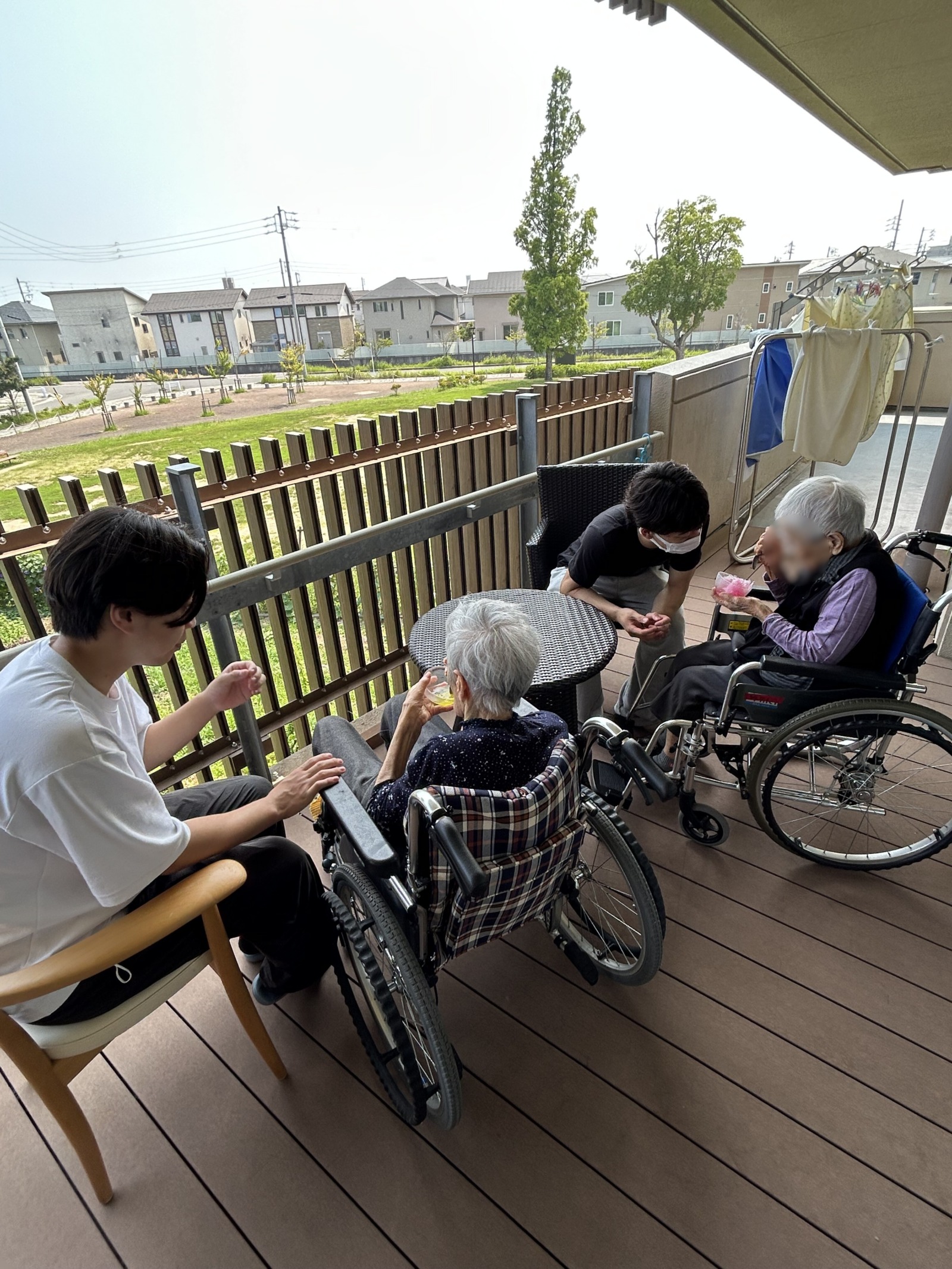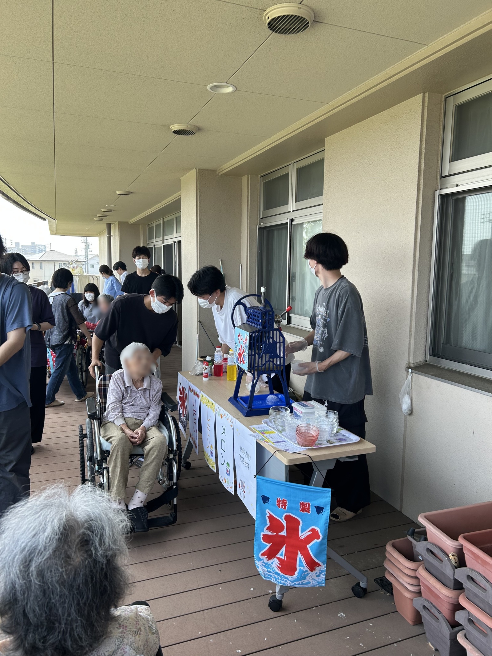 7月3日(木)にグループ施設である桜の森白子ホームで「おやつの配膳ボランティア」を行いました。この日の“おやつ”はかき氷で、学生たちは利用者さんに好みの味を聞いたり、かき氷を配ったりしながら利用者さんと交流をしました。