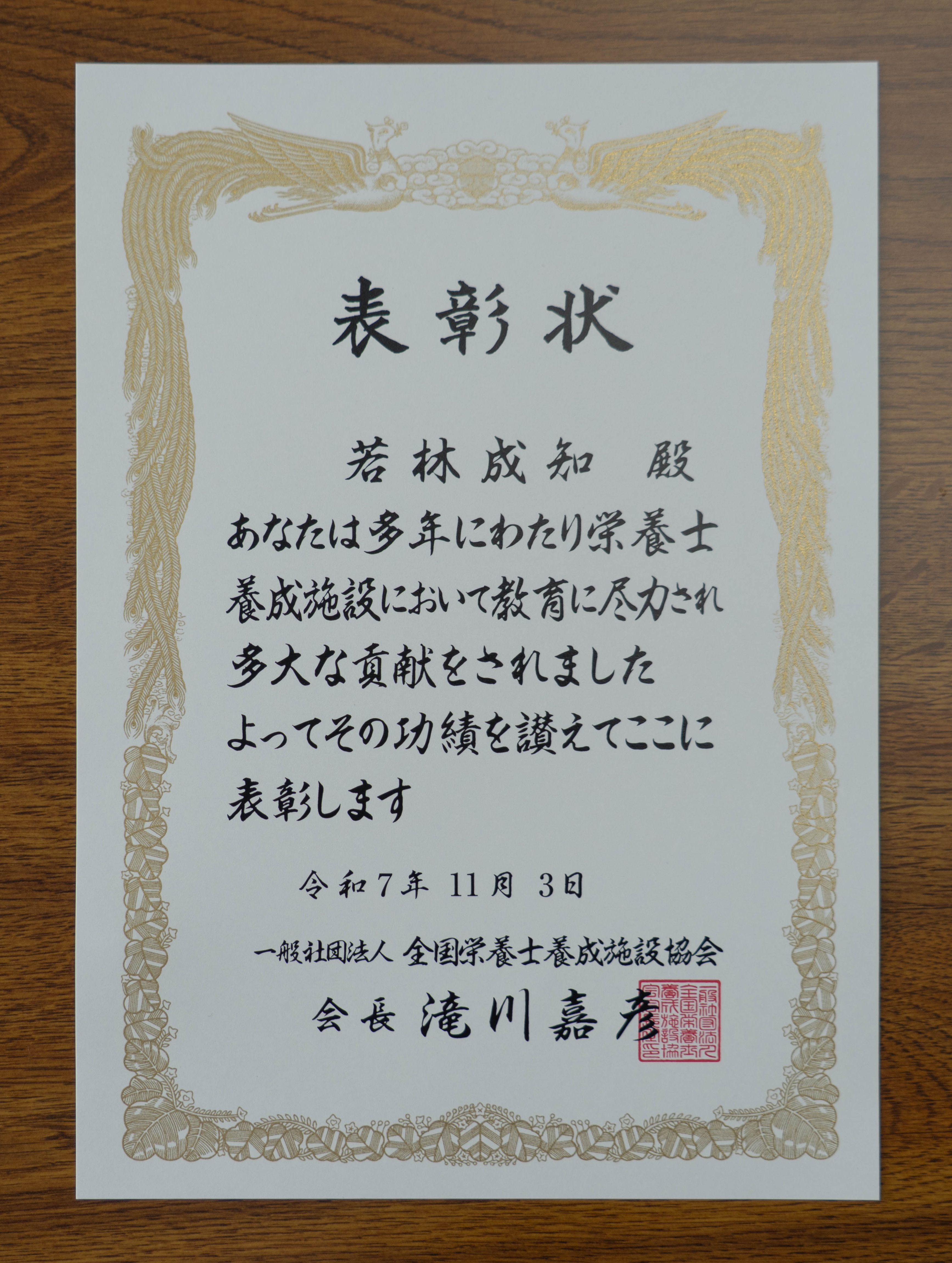 若林教授の教育・研究、そして社会への貢献は、次世代の栄養士・管理栄養士の育成に大きな影響を与えており、今回の会長顕彰受賞は、これまでの長年にわたるご尽力と成果が高く評価されたものです。今後のさらなるご活躍を祈念し、医療栄養学科教員一同、心よりお祝い申し上げます。