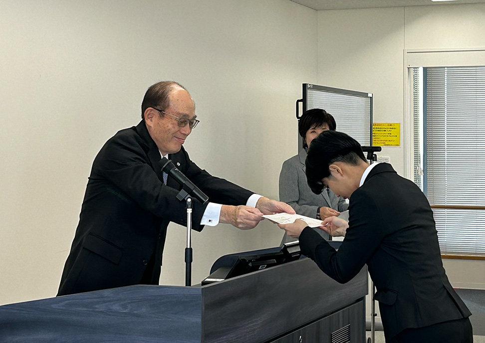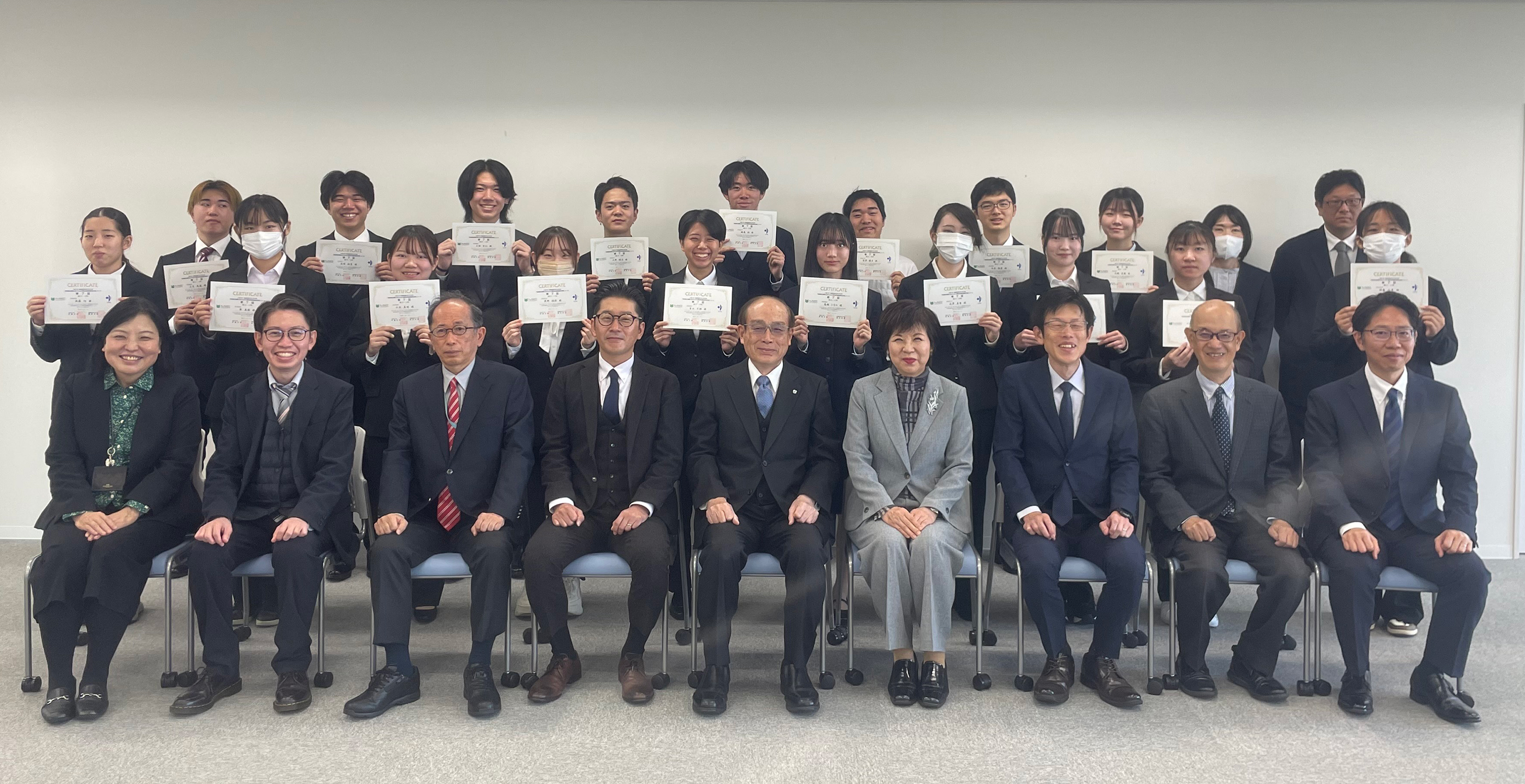 このプログラムでは、1年次後期の講義と2年次8月の体験型学習ワークショップの両方を受講し、単位取得した学生に対して修了証が授与されます。当日は、豊田長康学長から学生一人ひとりに修了証が手渡されました。 その後、「このプログラムは両大学の多くの教職員が時間をかけて作り上げたもので、受講した学生から評価が大変高い。両大学の学生が一緒になって、慢性疼痛をテーマにディスカッションを行うことは、大変貴重な機会になったと思う。今後も地域医療に関わる医療者のコミュニティの輪を広げ、この経験を活かして今後も活躍していただきたい。」とお祝いの言葉が述べられました。また今年度は多くの慢性疼痛教育委員の先生方にもご参加いただき、ひとりずつ学生に向けて温かい言葉が贈られました。