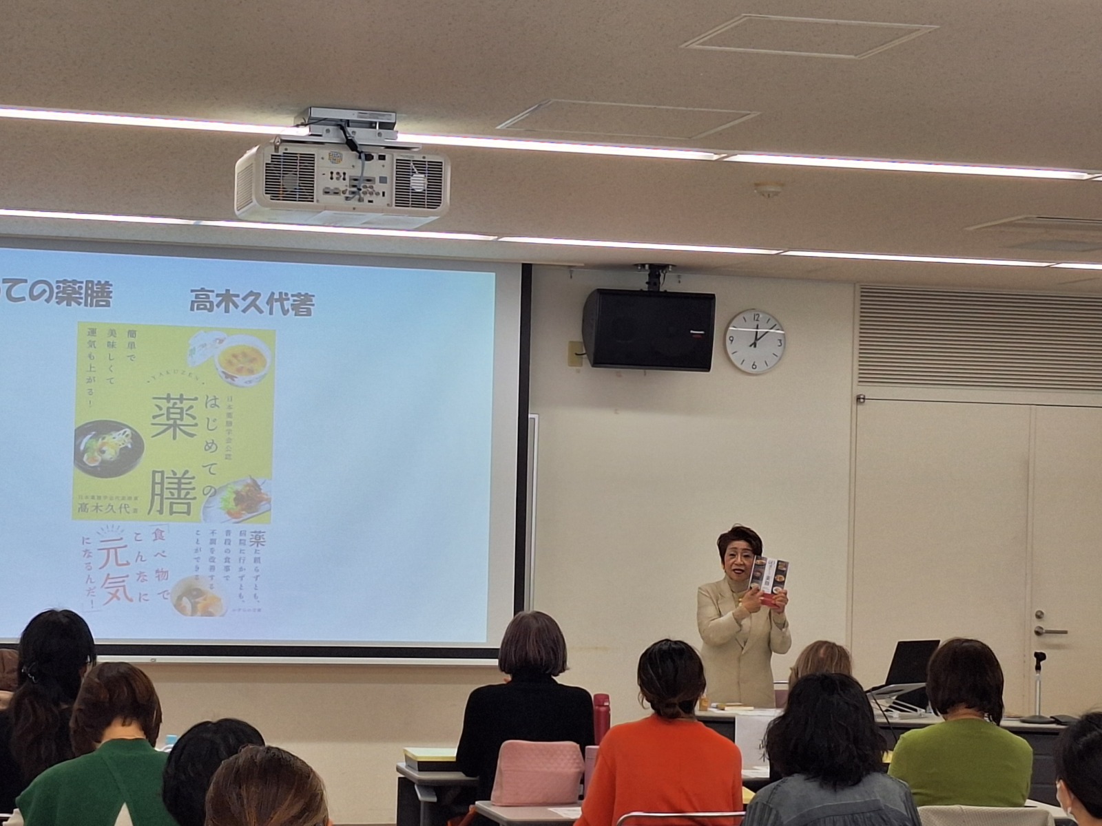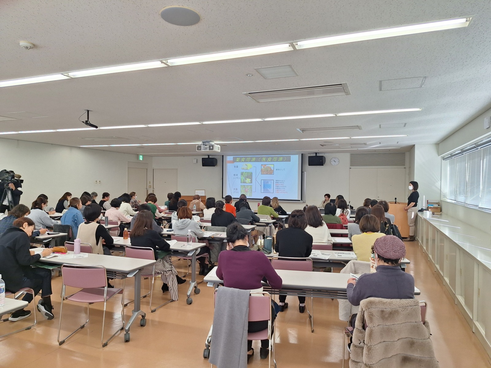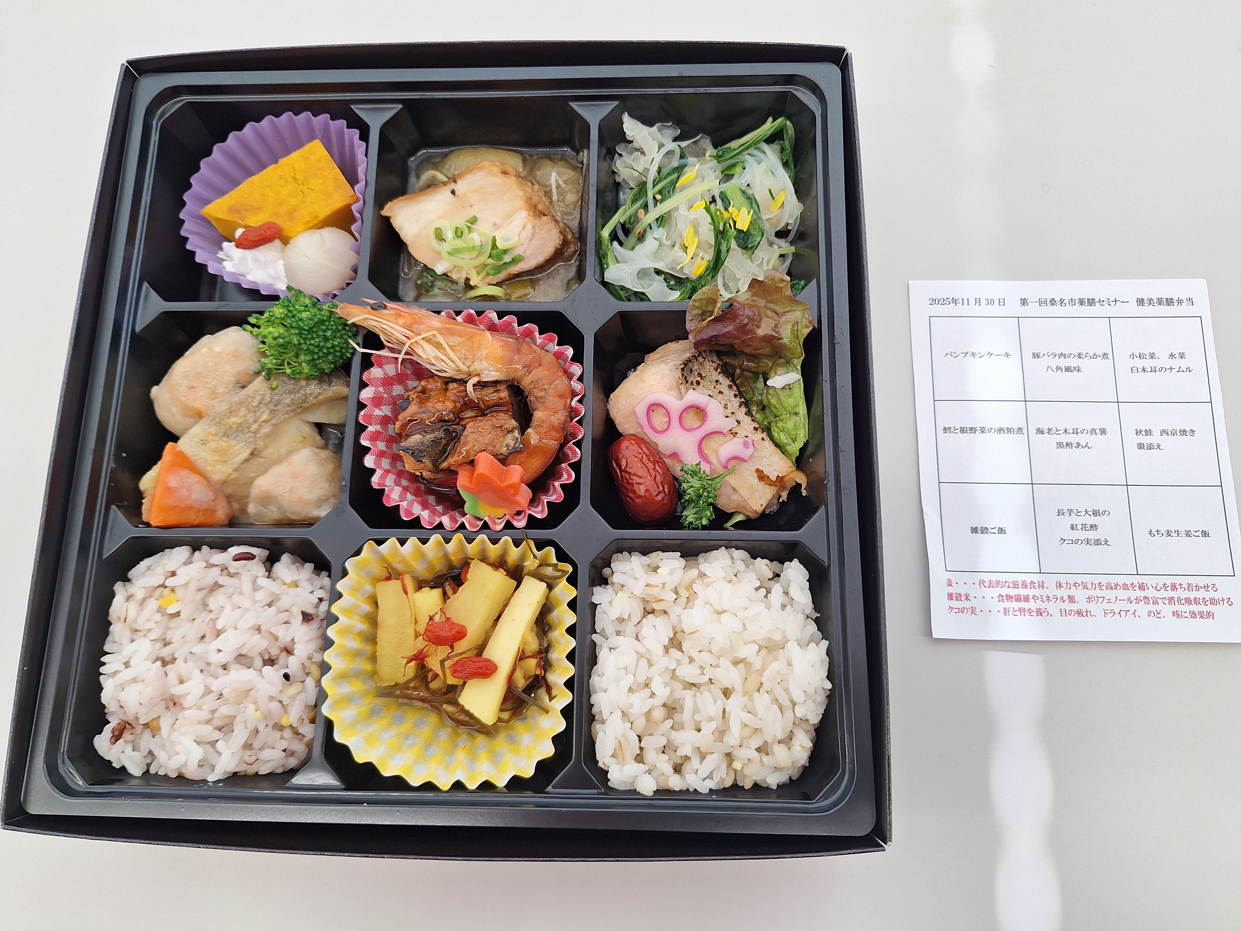 当日は約60名の市民の皆さまにご参加いただき、薬膳の基礎知識や日々の食生活への取り入れ方について理解を深めていただきました。講座では、髙木副学長が、食材の特性を理解し、季節・年齢・性別・体質に合わせて選ぶことの重要性を分かりやすく解説しました。特にこれから迎える冬は寒さで身体に不調を招きやすい季節であるとして、ショウガやネギ、ラム肉など身体を温める食材の活用法を紹介しました。また講座後には、髙木副学長の説明を聞きながら「鱈と根野菜の酒粕煮」「豚バラ肉の柔らか煮八角風味」「もち麦生姜ご飯」等を盛り込んだ薬膳弁当を味わい、参加者の皆さまに薬膳の魅力を体感していただきました。