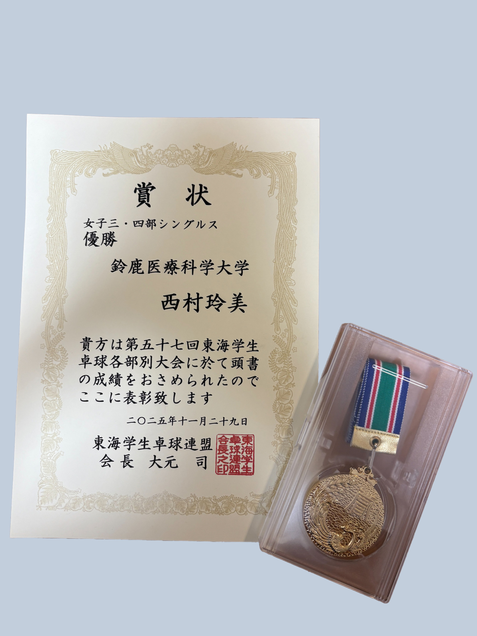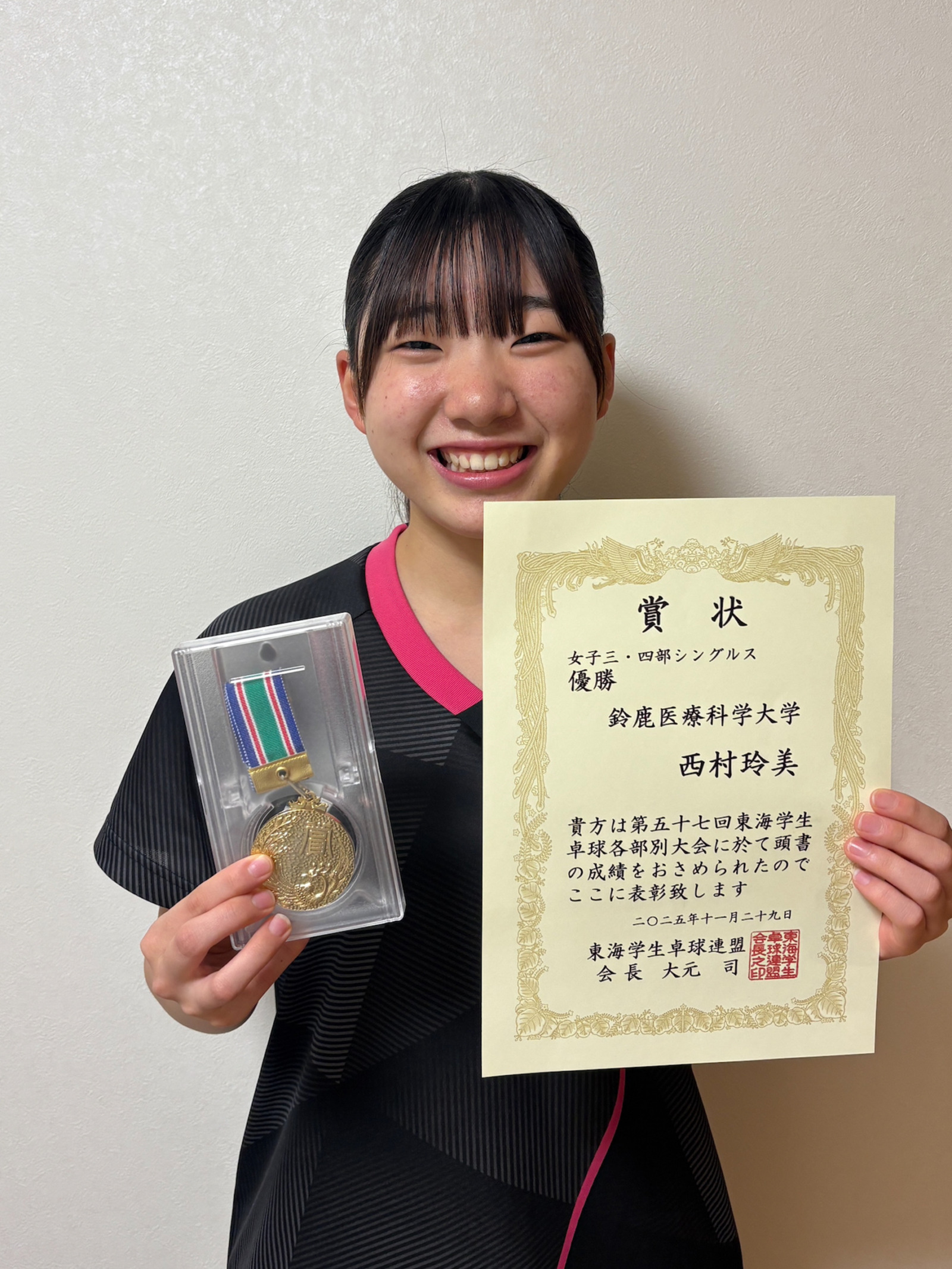 11月29日(土)に名古屋市北スポーツセンターで開催された「第57回東海学生卓球各部別大会」において、卓球部の西村玲美さん(保健衛生学部 リハビリテーション学科 理学療法学専攻 1年)が<女子3・4部シングルス>の部で優勝しました。