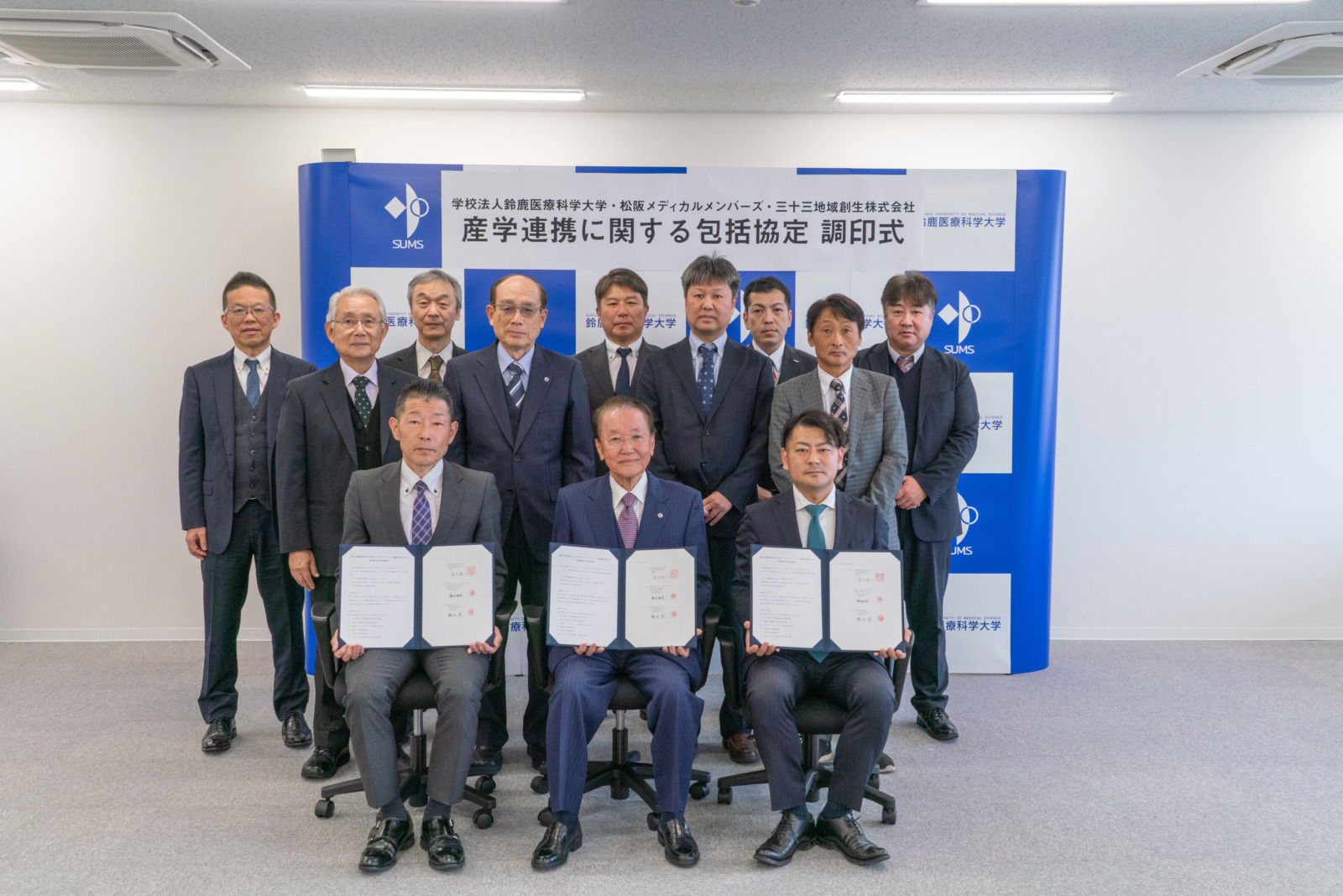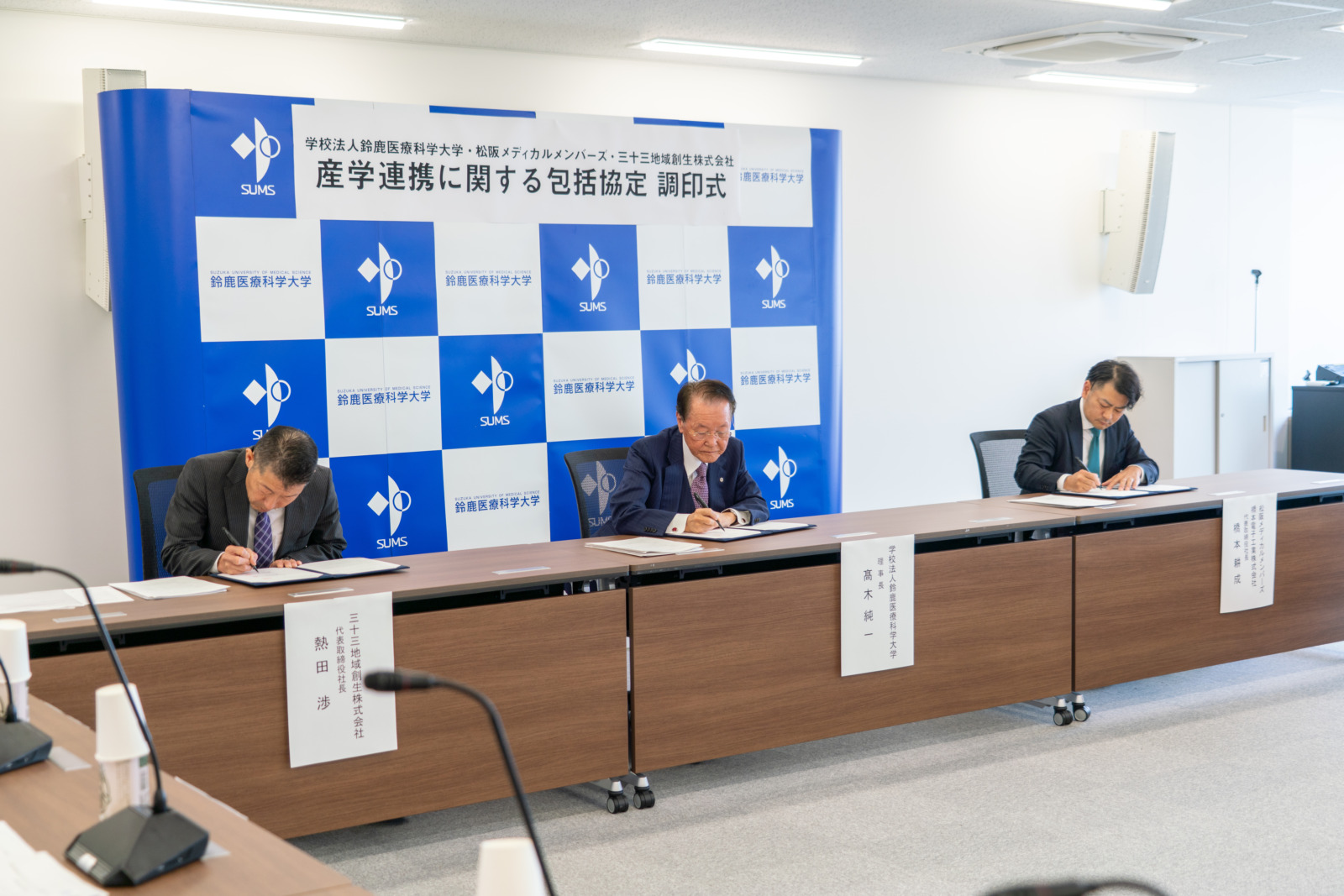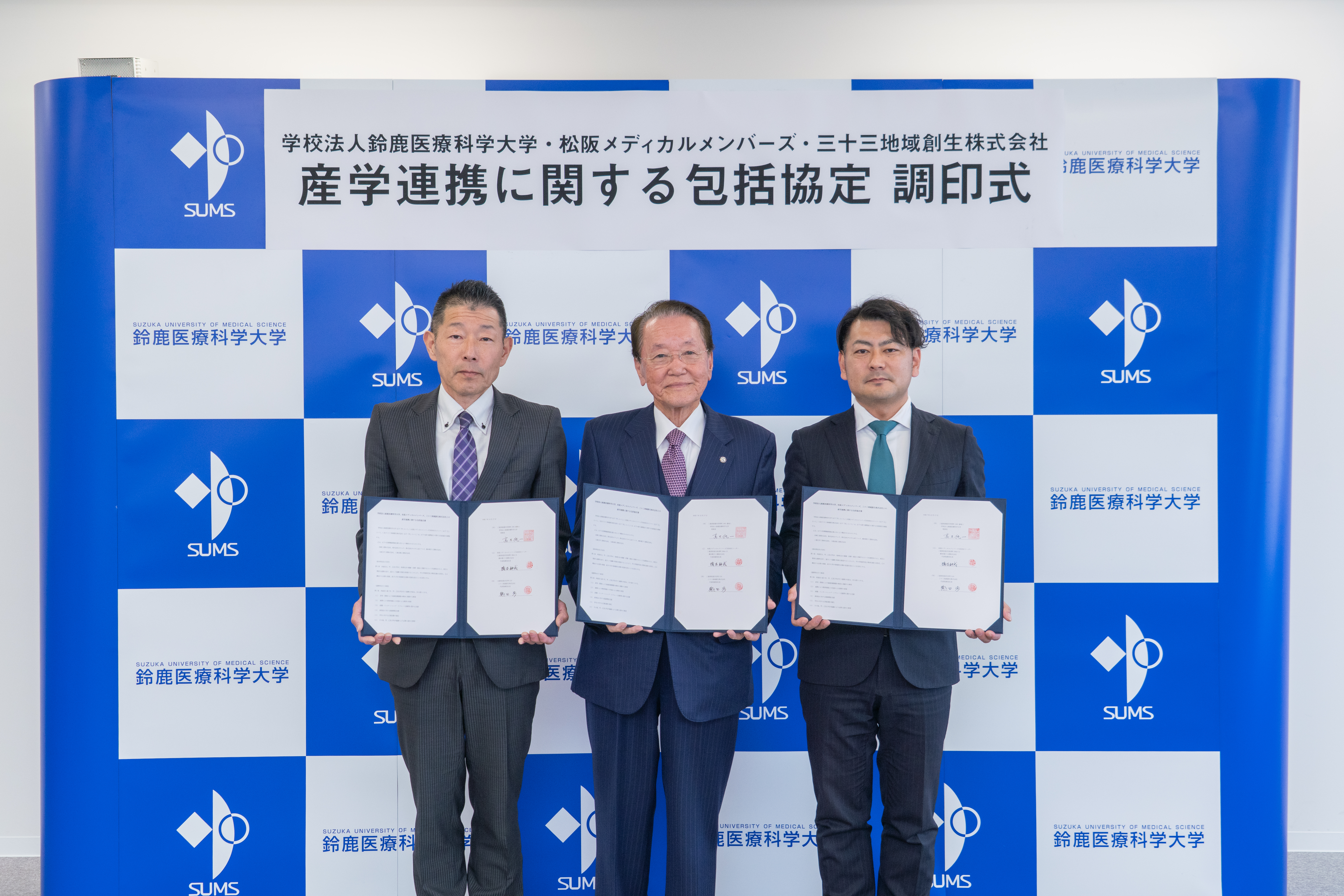 本学は、松阪市内に拠点を置く医療機器関連の6社で構成する「松阪メディカルメンバーズ(MMM)」並びに、三十三銀行グループ「三十三地域創生株式会社」との3者で、産学連携の包括協定を締結しました。調印式に出席した松阪メディカルメンバーズ 橋本耕成 代表(橋本電子株式会社 代表取締役社長)、三十三地域創生株式会社 熱田渉 代表取締役社長、本学 髙木純一 理事長がそれぞれの期待を述べ、調印を交わしました。