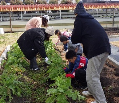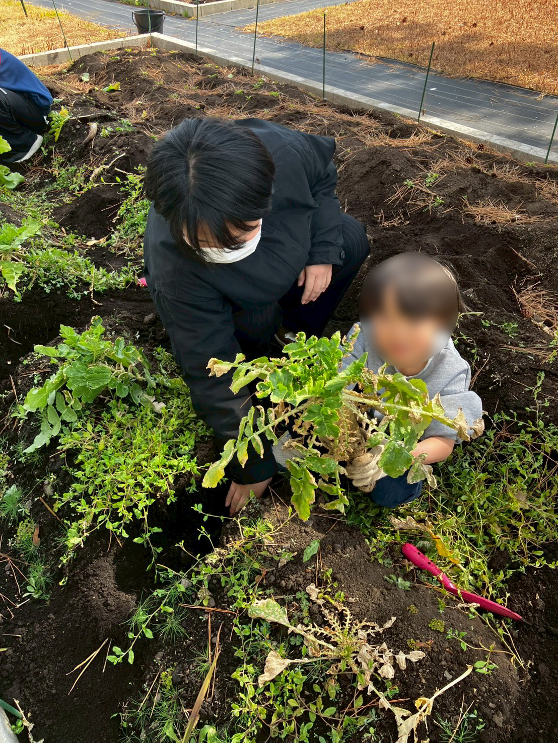 2026年2月14日(土)、SUMS自然農園に、小学生2名、未就学児2名、そのお母さん3名、引率者1名をお招きし、医療人底力実践Ⅳプレ開講でSUMS自然農園の活動に参加した学生1名と教員1名がサポート役となり、総勢10名で大根の収穫作業を行いました。(昨年に引き続き2回目の参加となる子どもとお母さんもいました)。