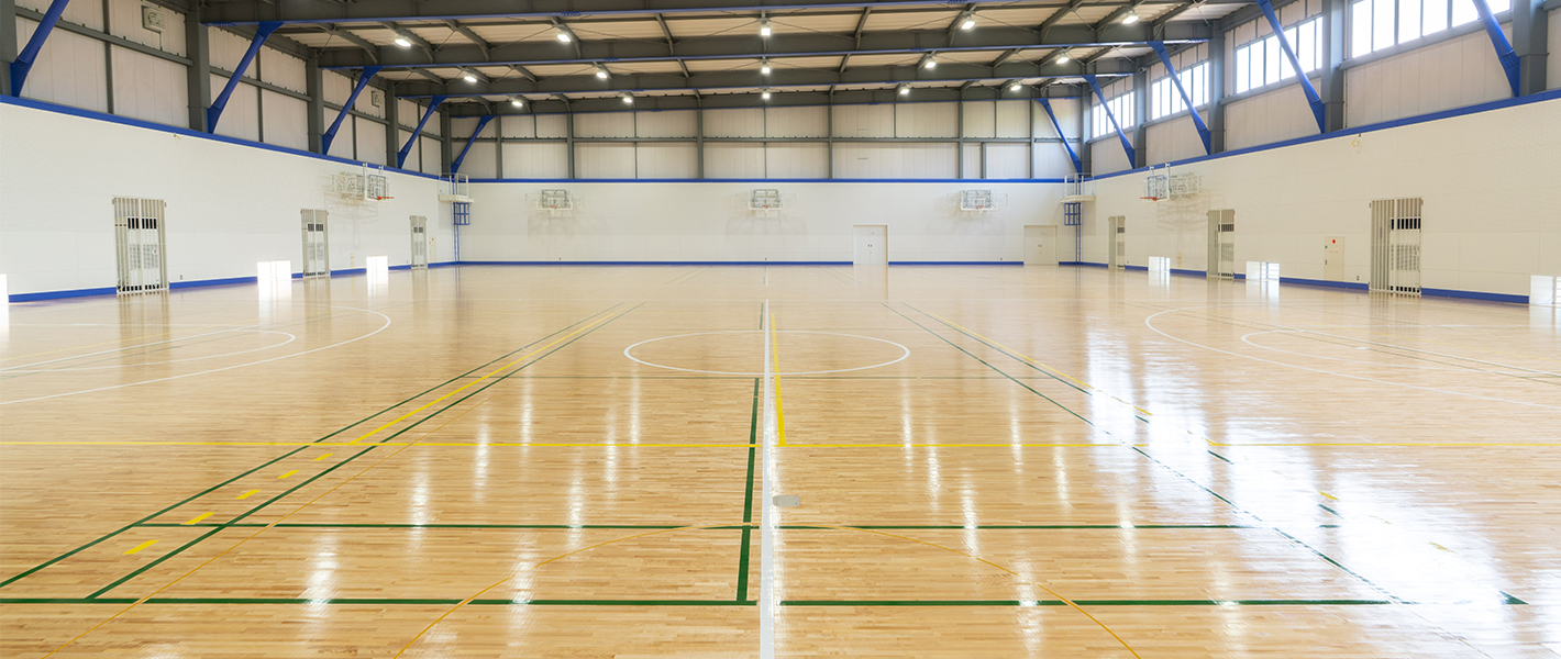 延床面積1,945㎡の鉄骨造で、競技場にはコート周囲に2.5mのスペースを確保したバスケットボール試合用コートを2面設置しています。