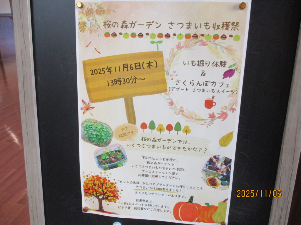 本日のイベントは桜の森ガーデンさつまいも収穫祭です。