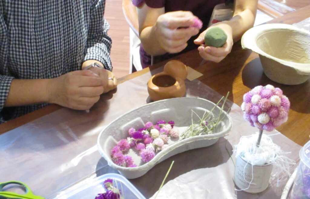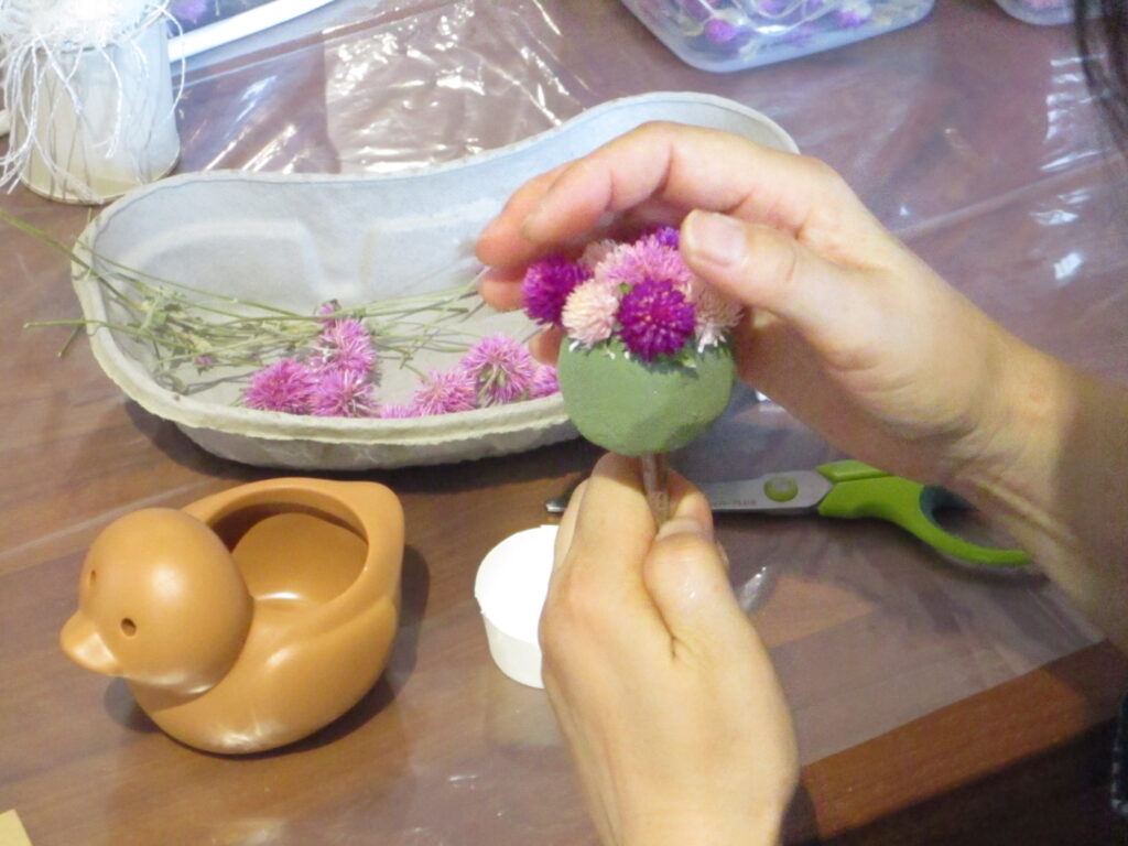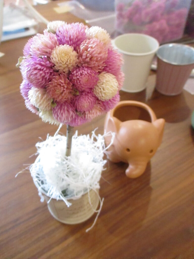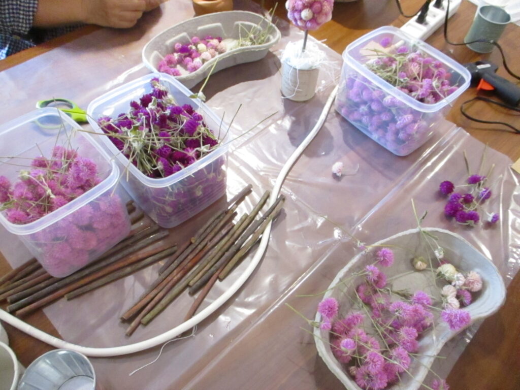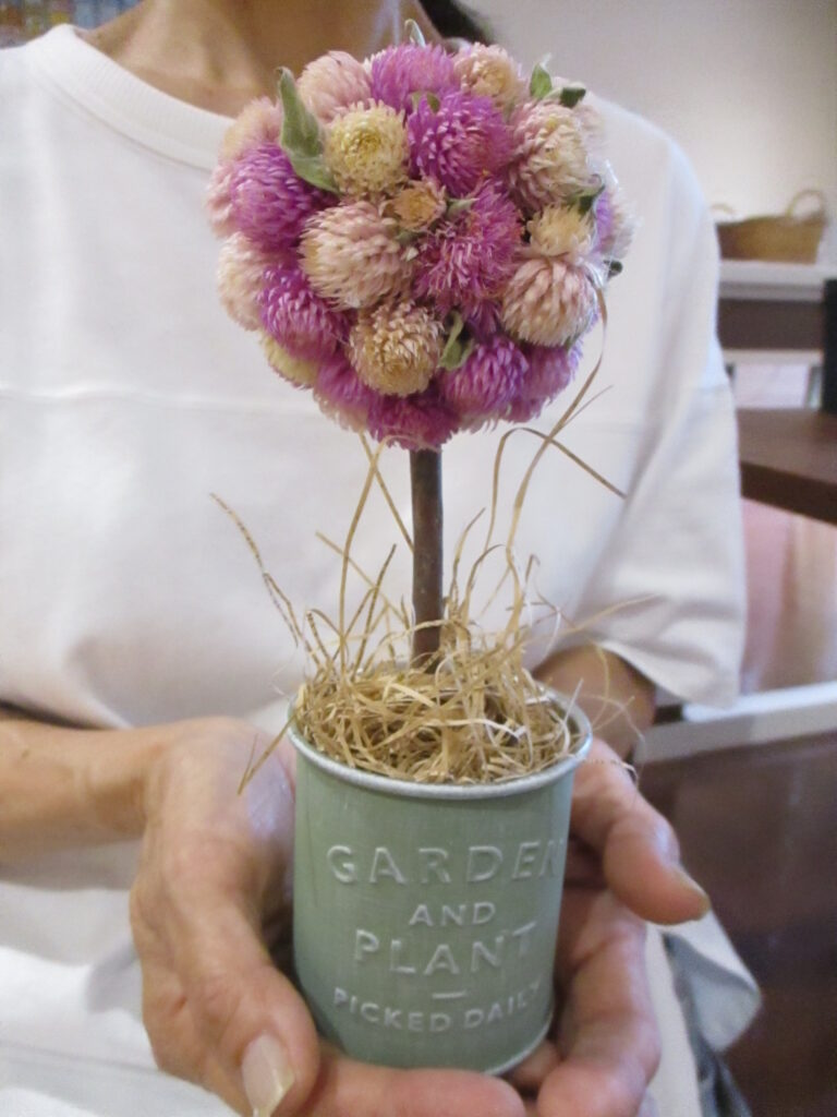 今回は、桜の森ガーデンで咲いた千日紅を使って、トピアリーづくりをしました。